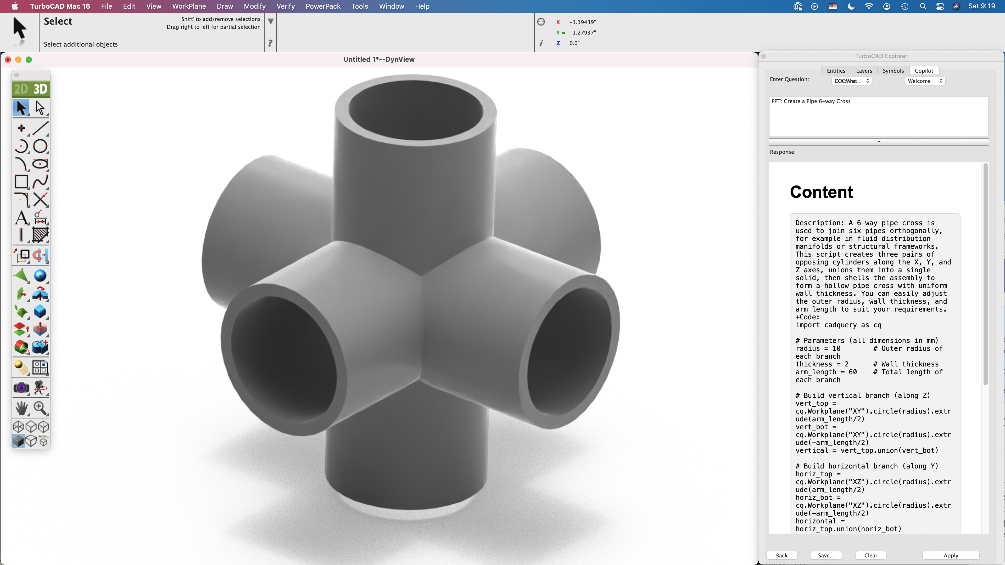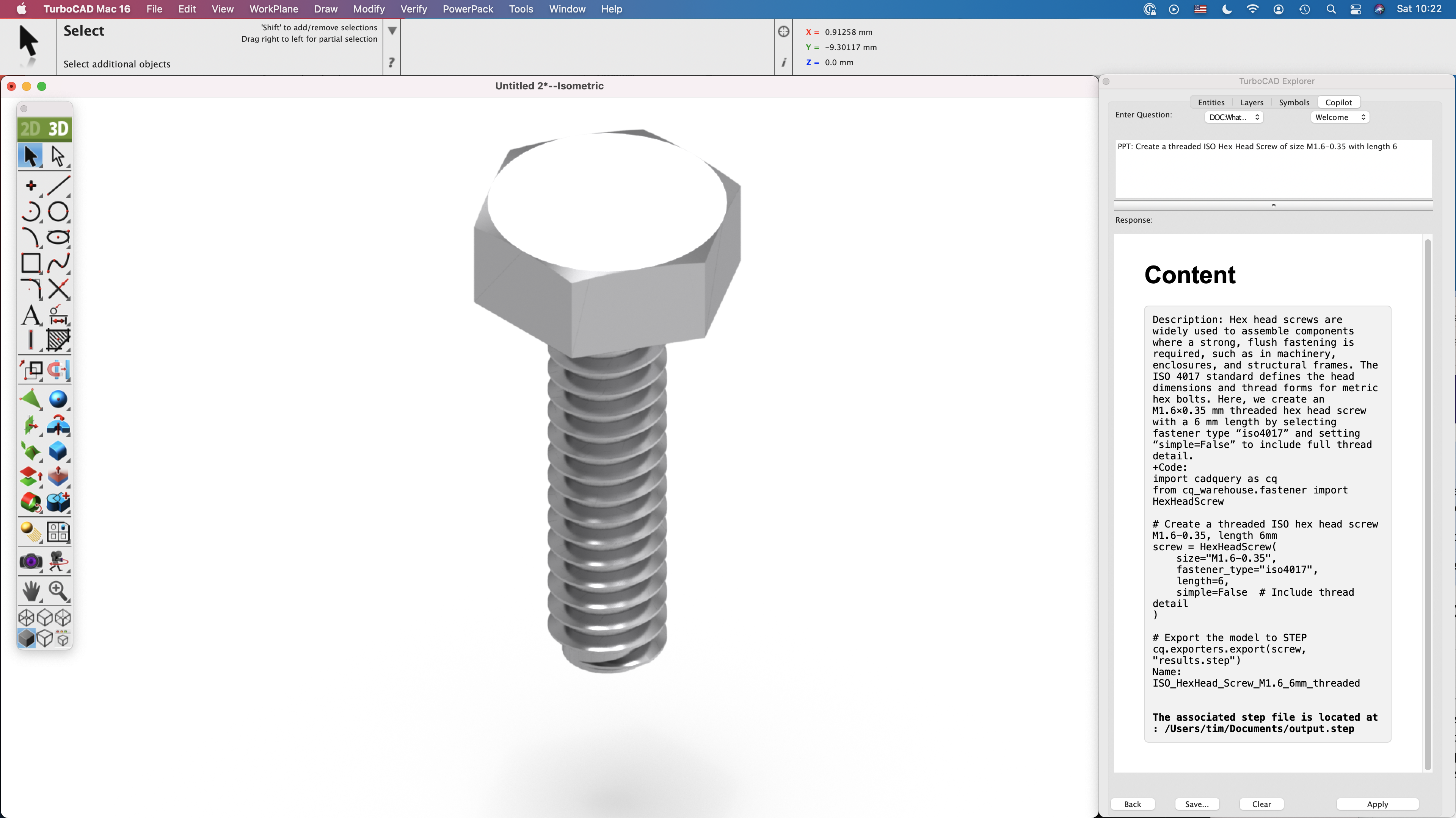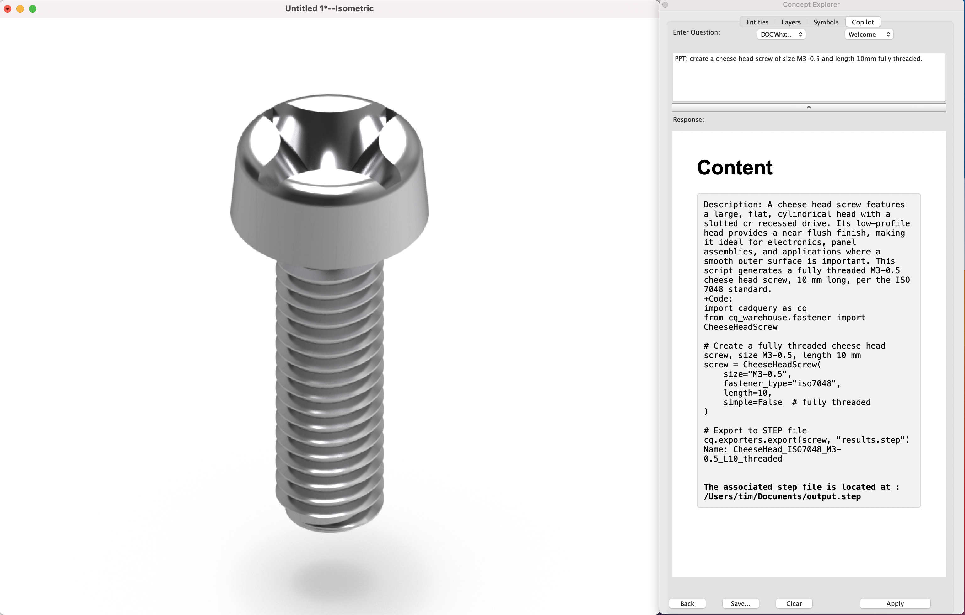Copilot’s Part Creator AI-Agent is by far our most advanced model. The Part Creator Agent has access to a variety of very specific CAD AI tools that 1) Convert Text into Python Scripts, 2) Integrate Python Scripts into a precise modeling engine that can create accurate CAD parts, 3) Access many, many, numerous scripts for part training, 4) Check each part contains valid geometry and topology via ACIS. Below are example questions and responses. Click on the image to display a full size image for readability.