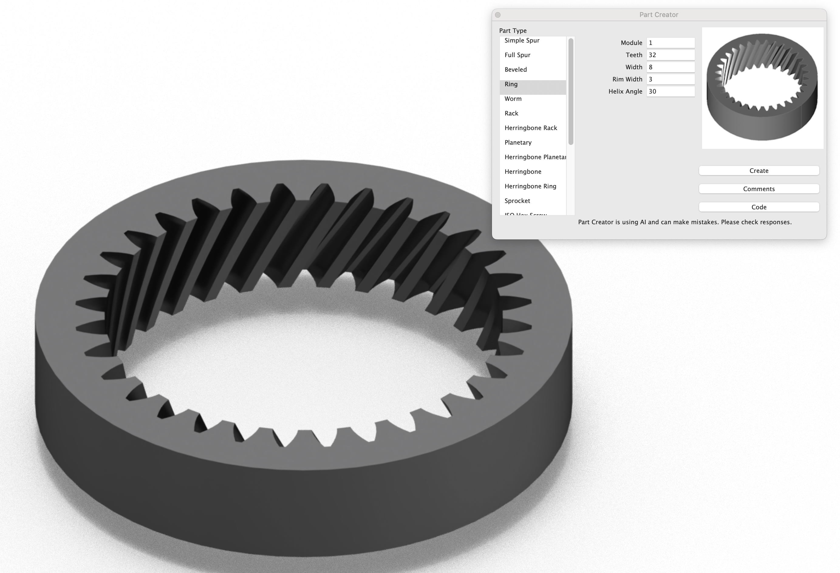 The Herringbone Ring Gear part creates a gear with the following parameters:
